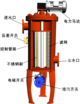采用機電一體化設(shè)計。全自動自清洗過濾器由驅(qū)動機構(gòu)、控制管路(包括壓差開關(guān))、主管組件、濾芯組件、清洗機構(gòu)、連接法蘭等主要零部件組成。 電控器、控制管路和排污閥構(gòu)成過濾器的控制部分,用于實現(xiàn)自動清洗排污過程。 控制管路由壓差開關(guān)、管接頭、黃銅管等附件組成。過濾器常規(guī)產(chǎn)品使用不銹鋼轉(zhuǎn)刷,也可根據(jù)不同的使用條件(水溫、水質(zhì)),選用其它材質(zhì)的轉(zhuǎn)刷。